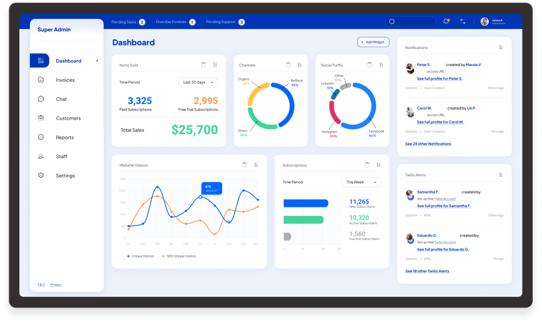 Choose from widgets with website analytics data, transactional data, sales or marketing data, add them to the dashboard, size to your preference and you can view your preferred dashboard save to your own user profile.